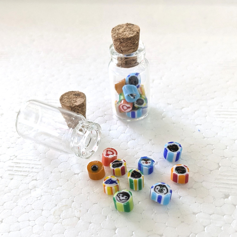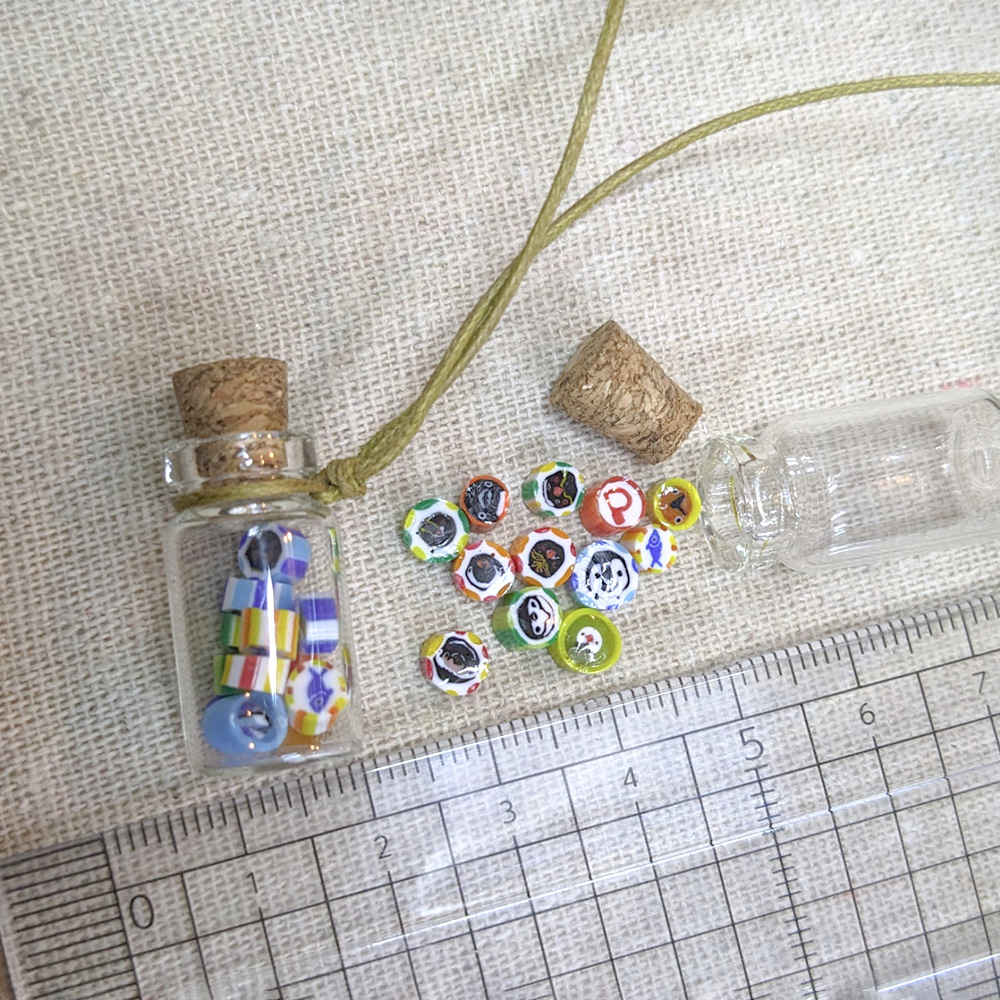 ペンギンモチーフで金太郎飴状のパーツをガラスで作り、カットして小さなコルク瓶に詰めました。ガラス製。食べられませんよ〜。