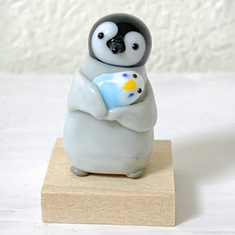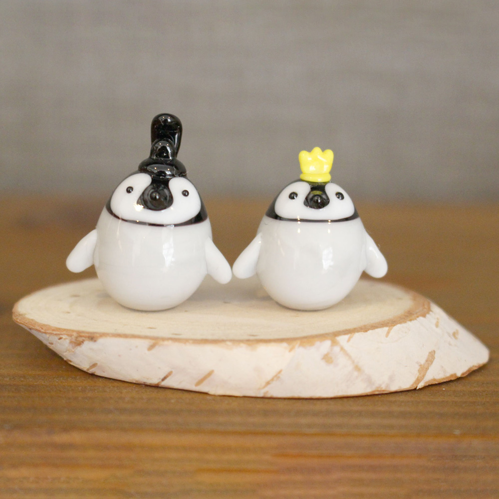 バーナーワークという技法でガラス棒を溶かし作品をつくっています。ガラスのつるっとした質感と丸みや重みがペンギンを表現するのにぴったりだと思っています。