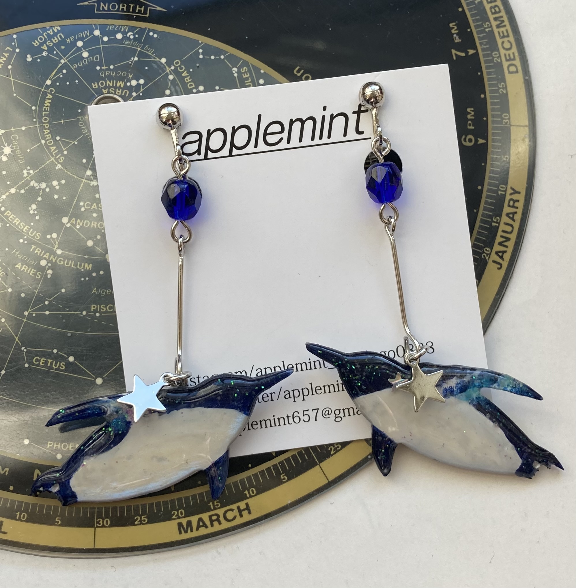 プラ板に手描きで銀河を描いて、レジンでコーティングしたアクセサリー。 蓄光材を入れているので、あらかじめ光を当てておくと、暗い所で星屑のようにほのかに光ります。