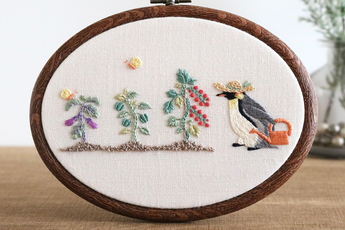 『ペンギンのお出かけシリーズ』と題して、ペンギンが四季の移ろいを楽しむ姿を刺繍で表現しております。海や山へお出かけしたり、家庭菜園をしたり、季節の行事に参加したり…。冒険心豊かなペンギンをお楽しみいただけます。あたたかみのある物語のような刺繍をお届けしたいと思い制作しております。