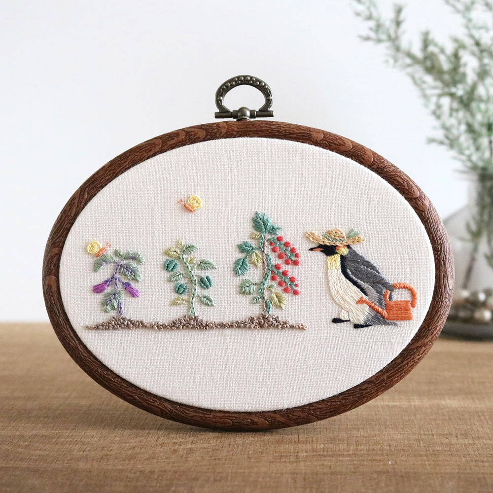 手刺繍ファブリックパネル『ペンギン、野菜を育てる』