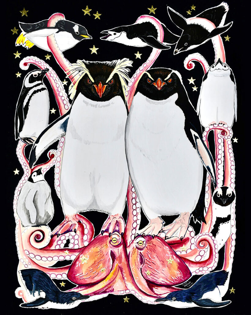 タイトル「キタとミナミ」アクリル絵具を使用したオリジナル原画です。キタイワトビペンギンとミナミイワトビペンギンがモチーフです。
