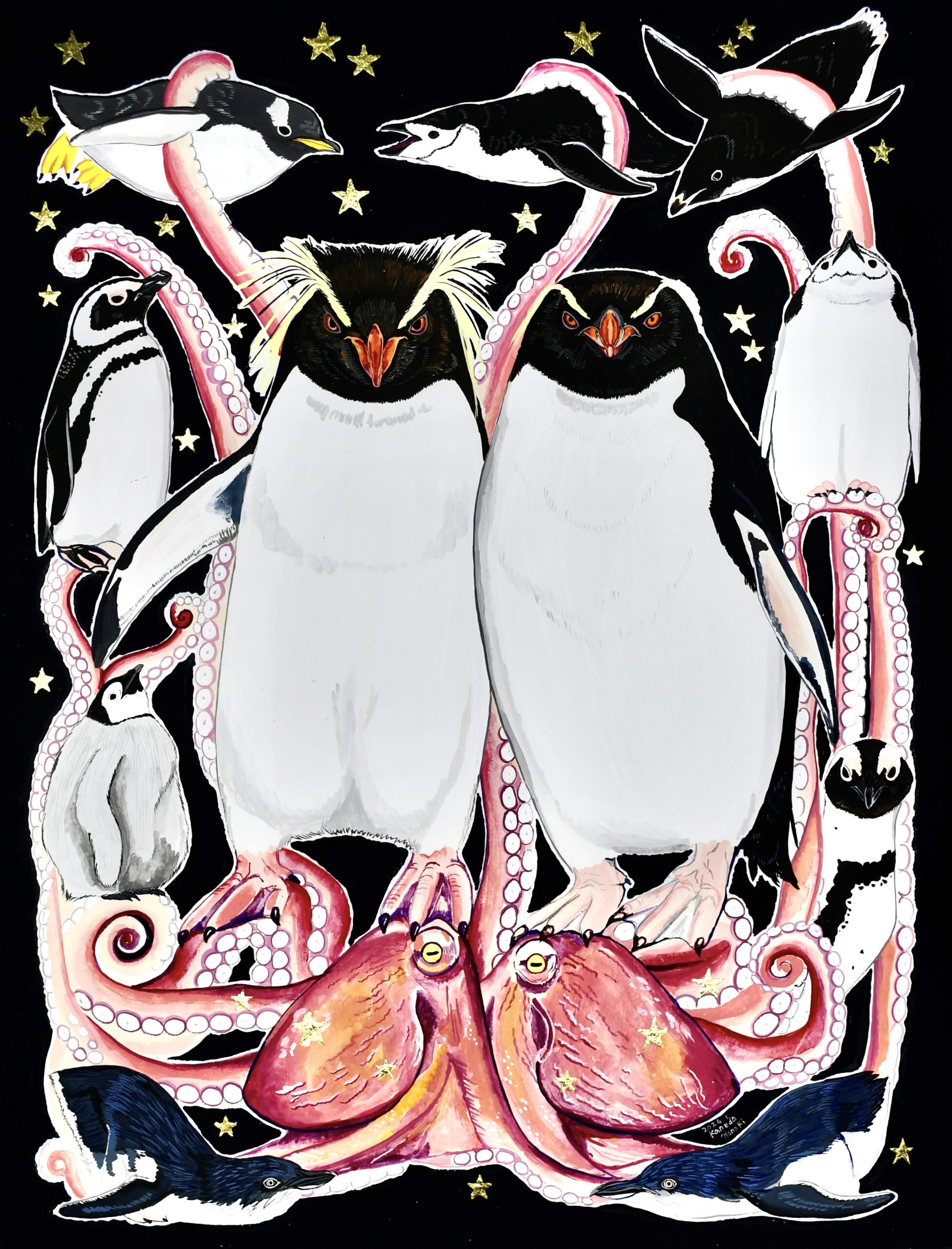 画家の金田花季です。アクリル絵具で動物画を描いています。 ラインストーンやグリッター、金箔など煌めく画材を使用した画面が特徴です。 作品に登場するペンギンはアデリーとコウテイが多め。 作品を使用したレターセットやステッカー、コースターやカードケースなどの雑貨も制作しています。