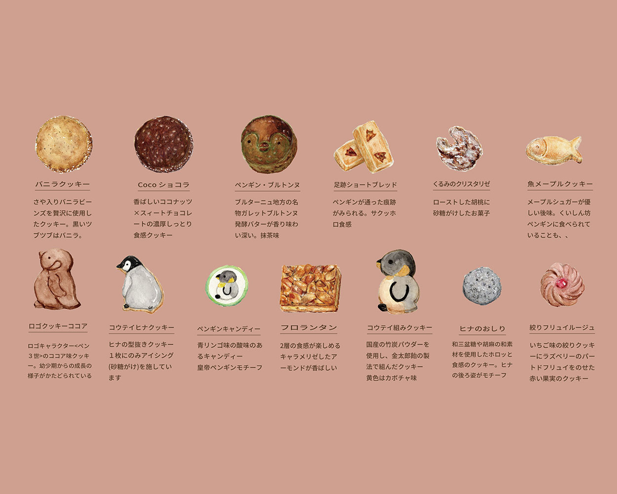 13種類のお菓子(ガレットブルトンヌ・クッキー・飴など)が入ったクッキー缶です。 缶はシルクスクリーンのロゴ入り。 説明書きにもこだわっているので、食べる際はぜひご覧になりながら楽しんでいただければと思っております。