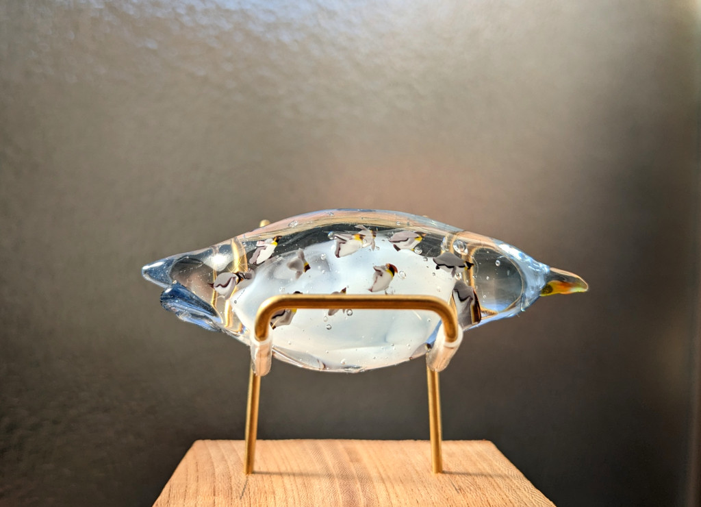 ペンギンのかたちのガラスのなかにペンギンが泳いでいる小ぶりなオブジェです。台座付き