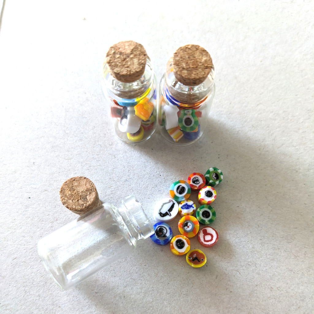 ペンギンモチーフで金太郎飴状のパーツをガラスで作り、カットして小さなコルク瓶に詰めました。中身は少しずつ違うものもあります。ガラス製。食べられませんよ〜。