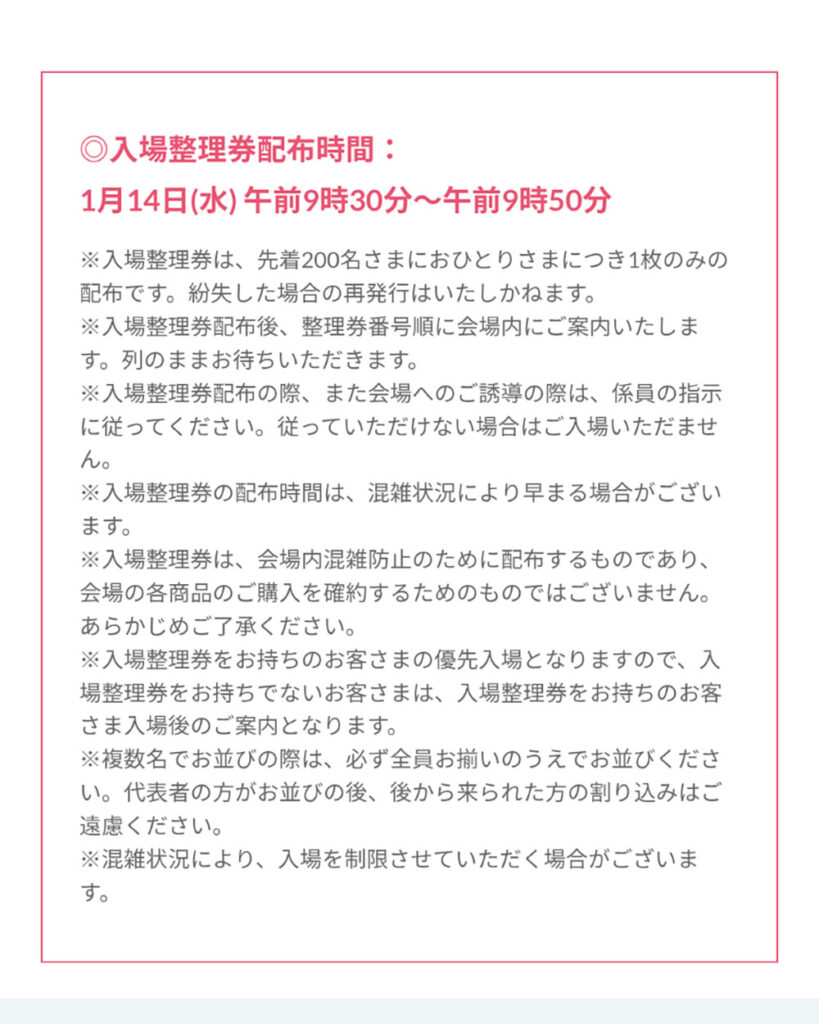 ※入場整理券は、会場内混雑防止のために配布するものであり、会場の各商品のご購入を確約するためのものではございません。あらかじめご了承ください。